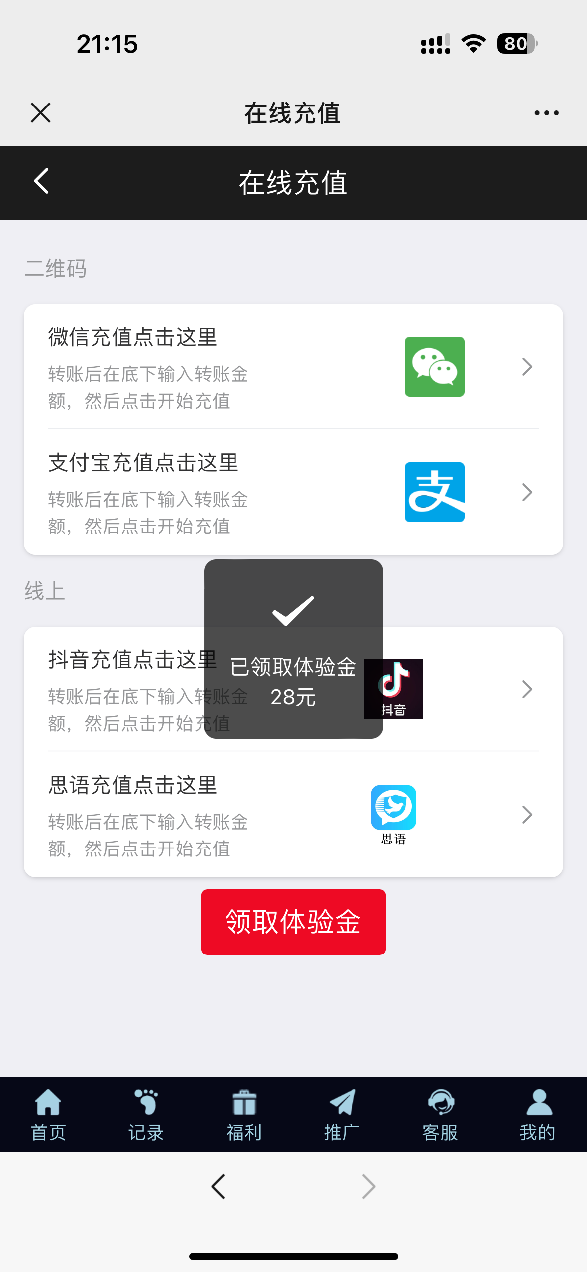 登陆直接点击充值领取28体验金秒到账28,下分不需要发朋友圈