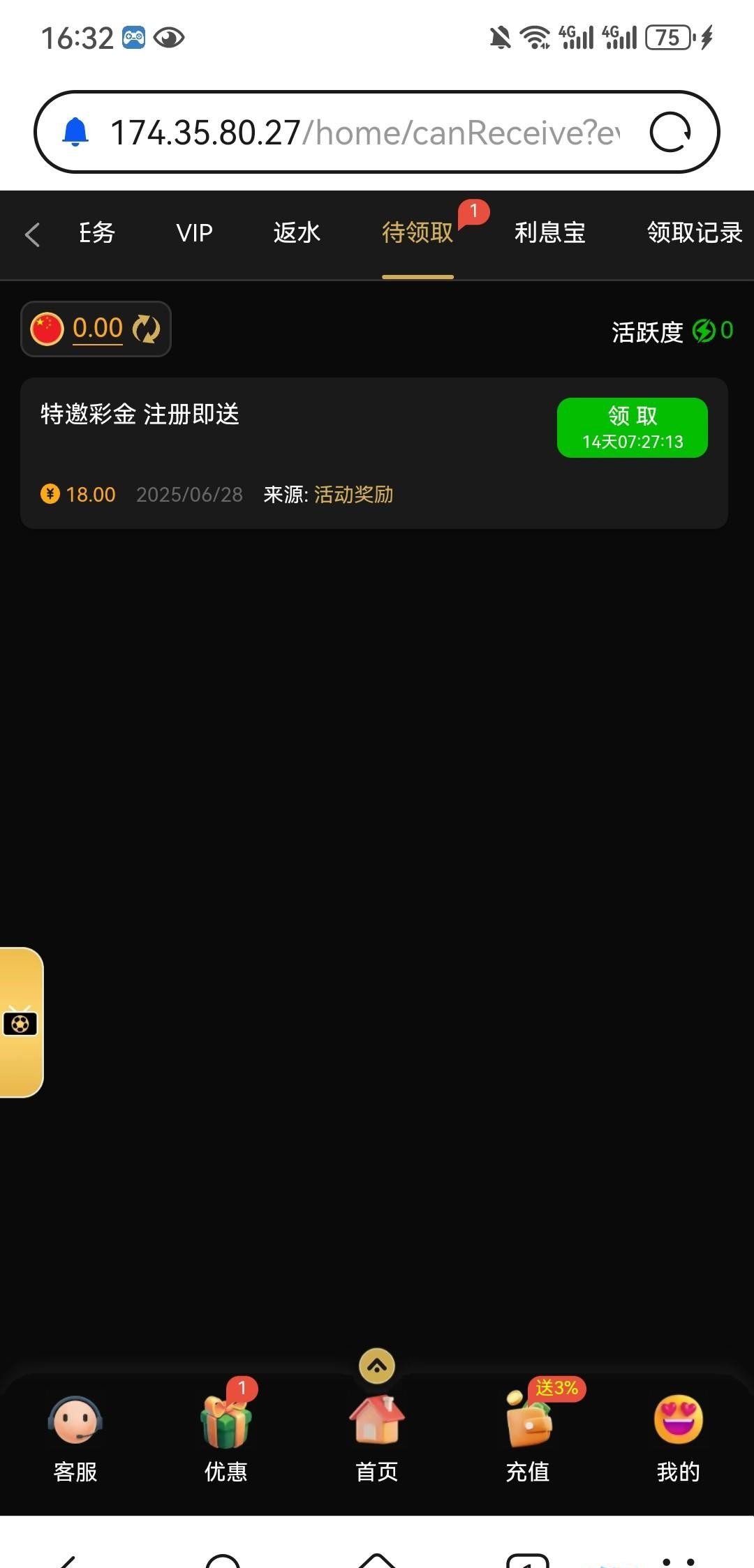 刚接到电话送了18,账号不知道什么时候注册的,没有充值过,没有号可以先注册等电话 网址4566.com