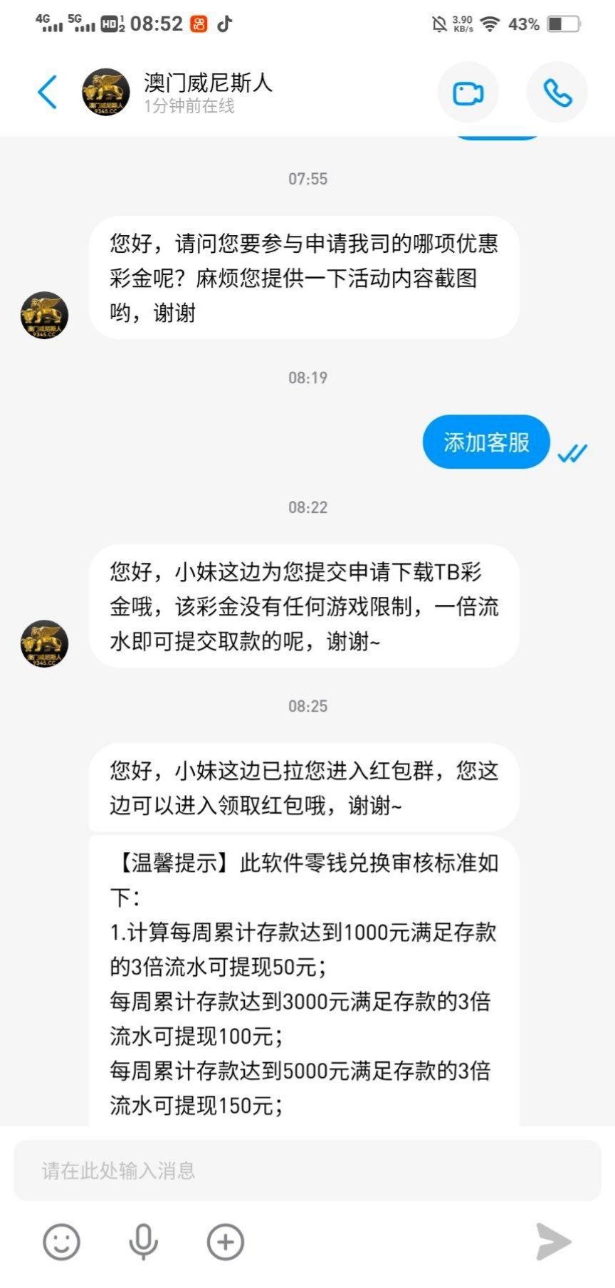 我充值过加talk blink客服申请加客服彩金申请到了38