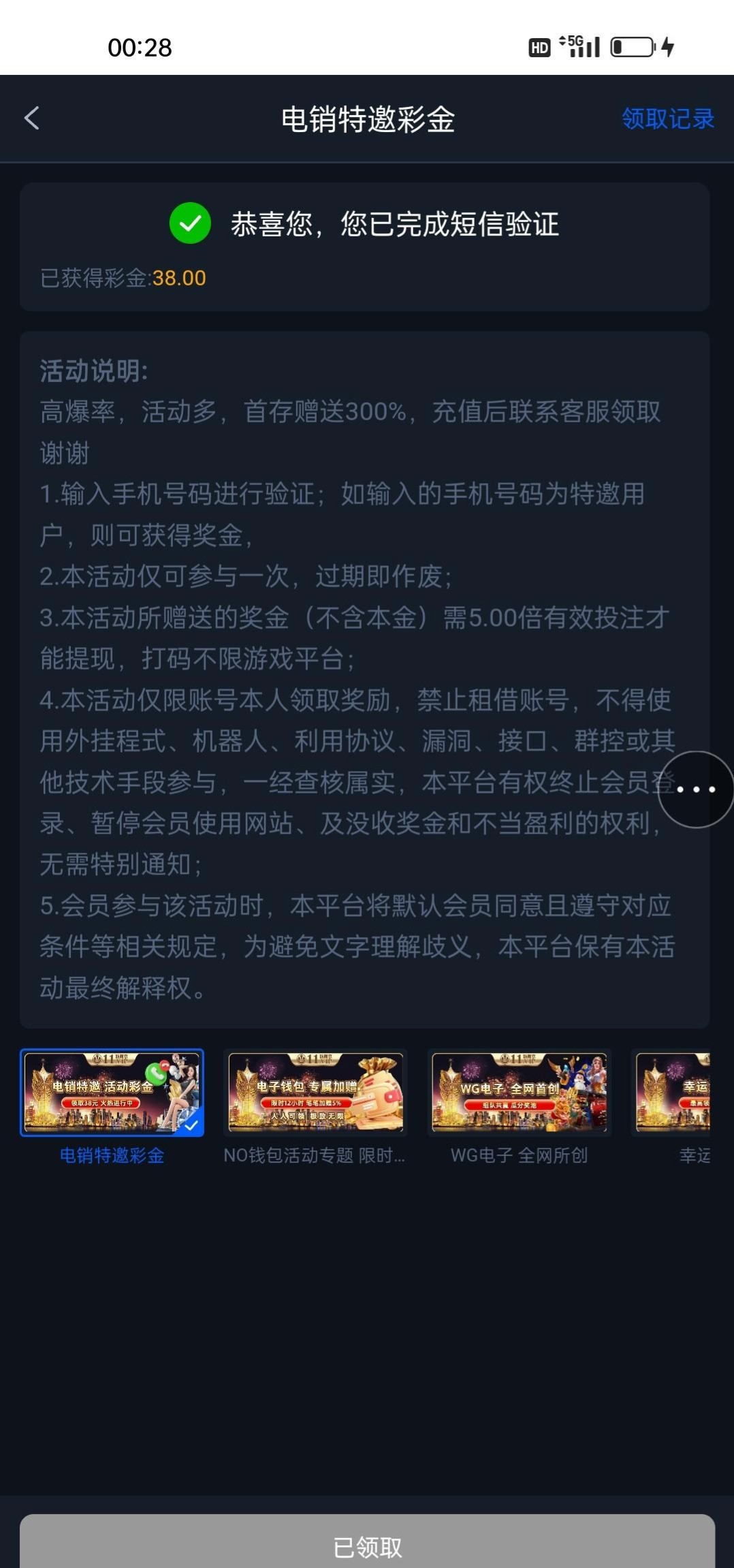 我是接到电话的,叫我注册账号然后在优惠活动里面自助领取的,你们可以注册账号之后去看一看能领取,不能领取的话就去找在线客服说领电销彩金。官方网站:11.vip   电话网站:233.st(没打出来提现自测)