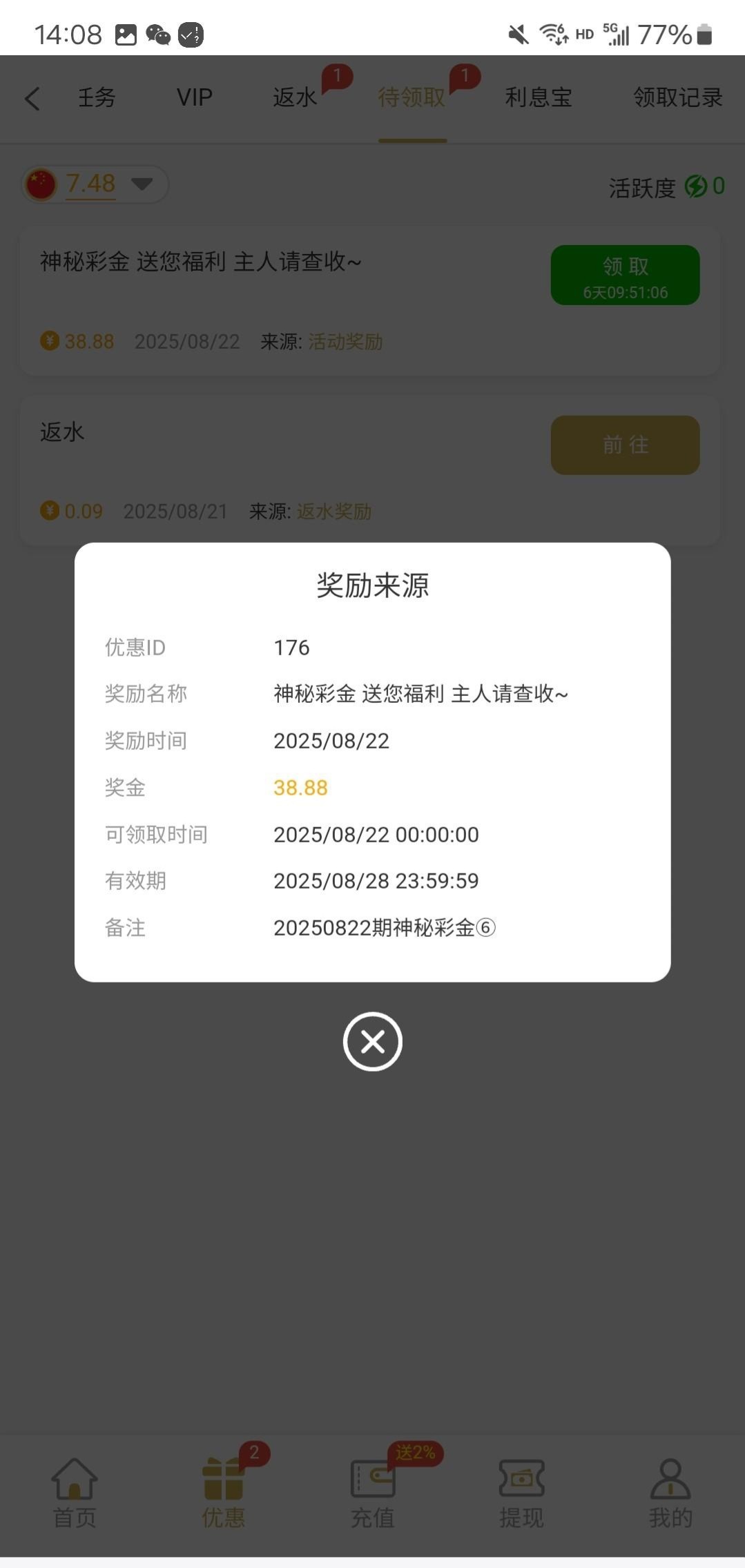 上号就有自助领取。十块二十的充过,每天抢红包抢到金额里面包含连起来的13 34 48就能申请十倍加赠。链接:1348.com