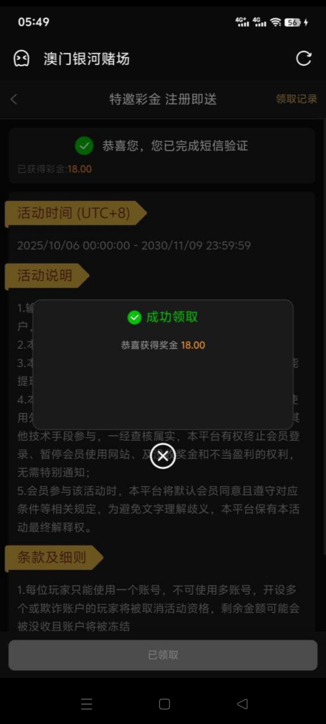 【澳门银河】自助领取18彩金