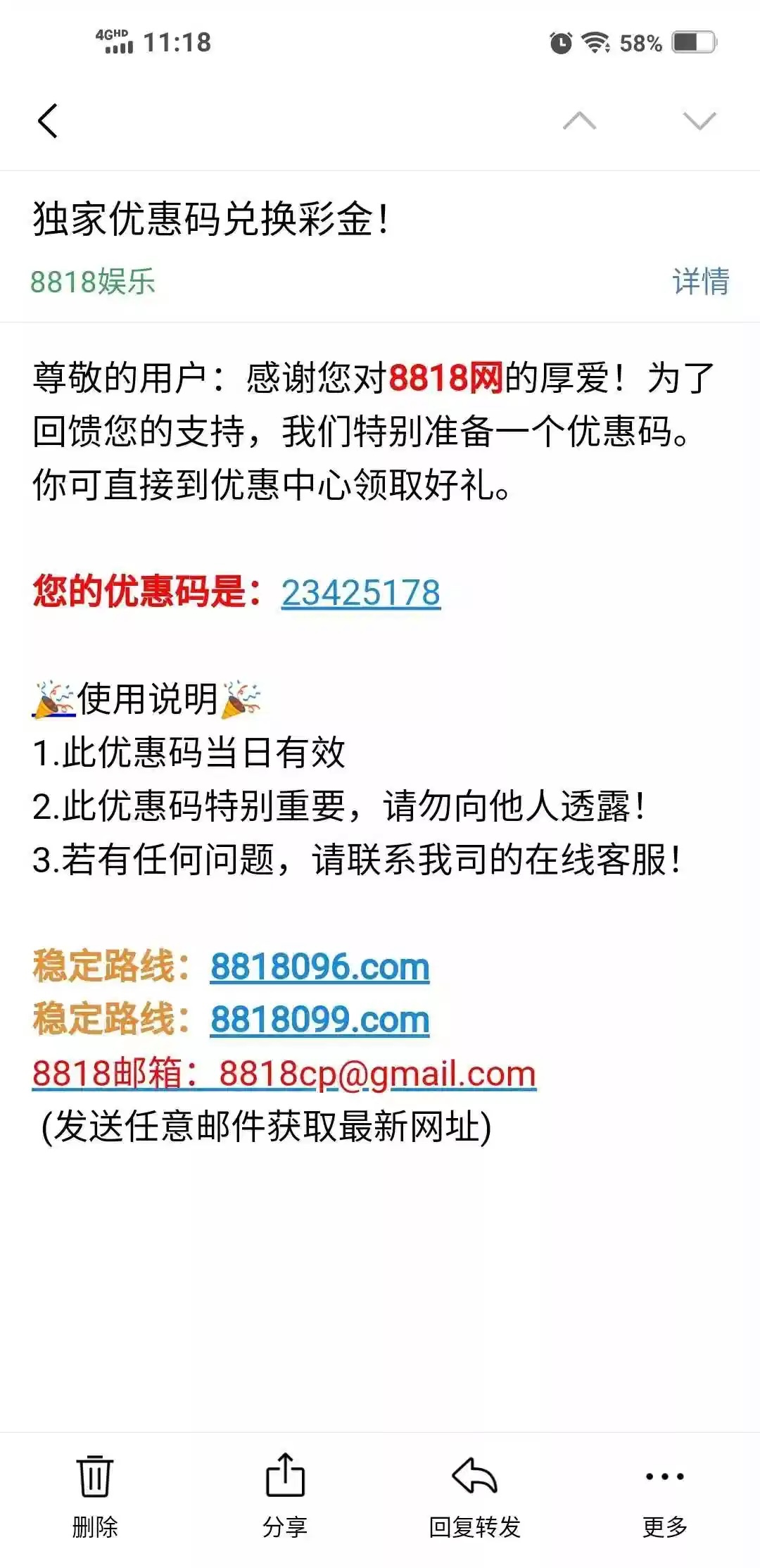 邮箱彩金又来了,听说通用的,充值过去看看能不能领,8818096.com