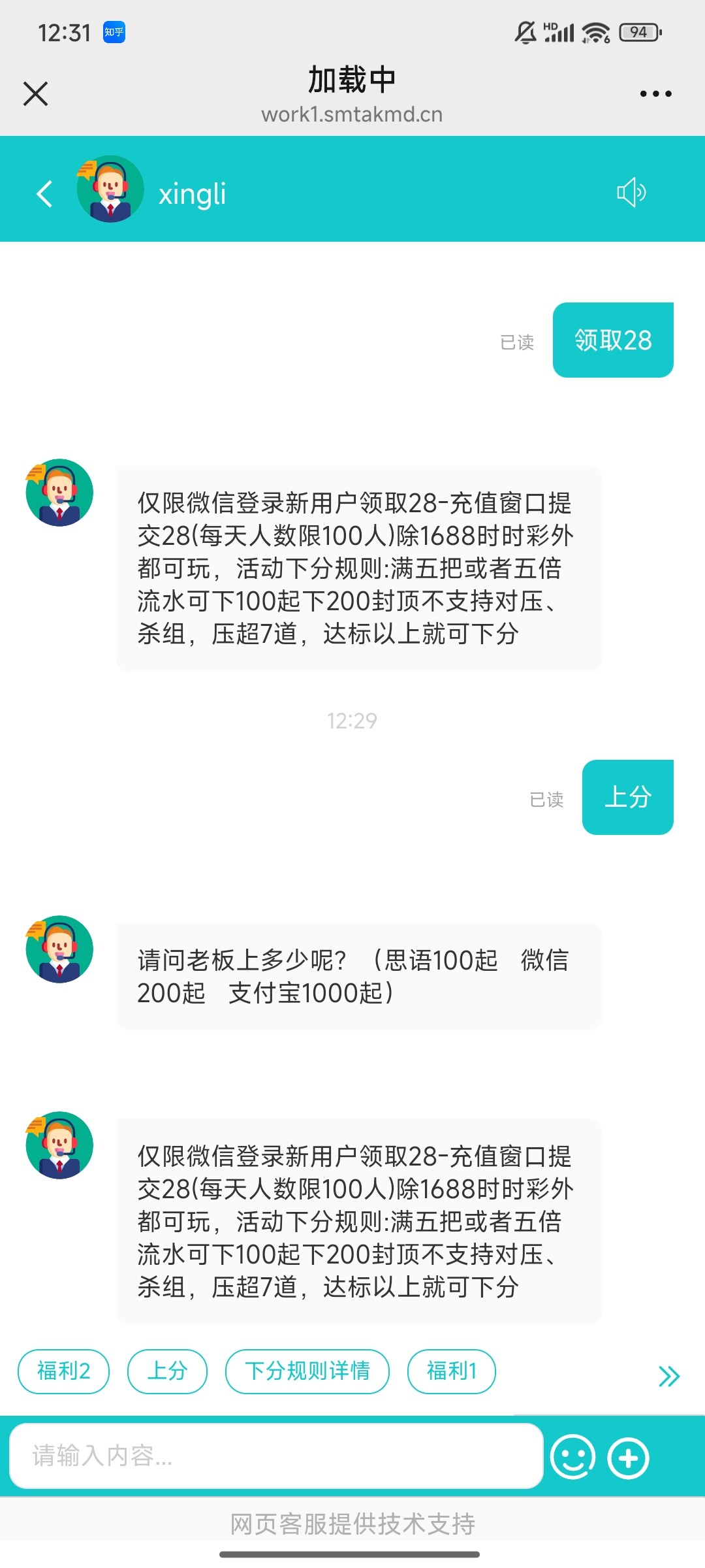 链接复制微信打开,用微信登录才送,问客服28还有没,然后充值通道提交28,5把或者5倍流水可下