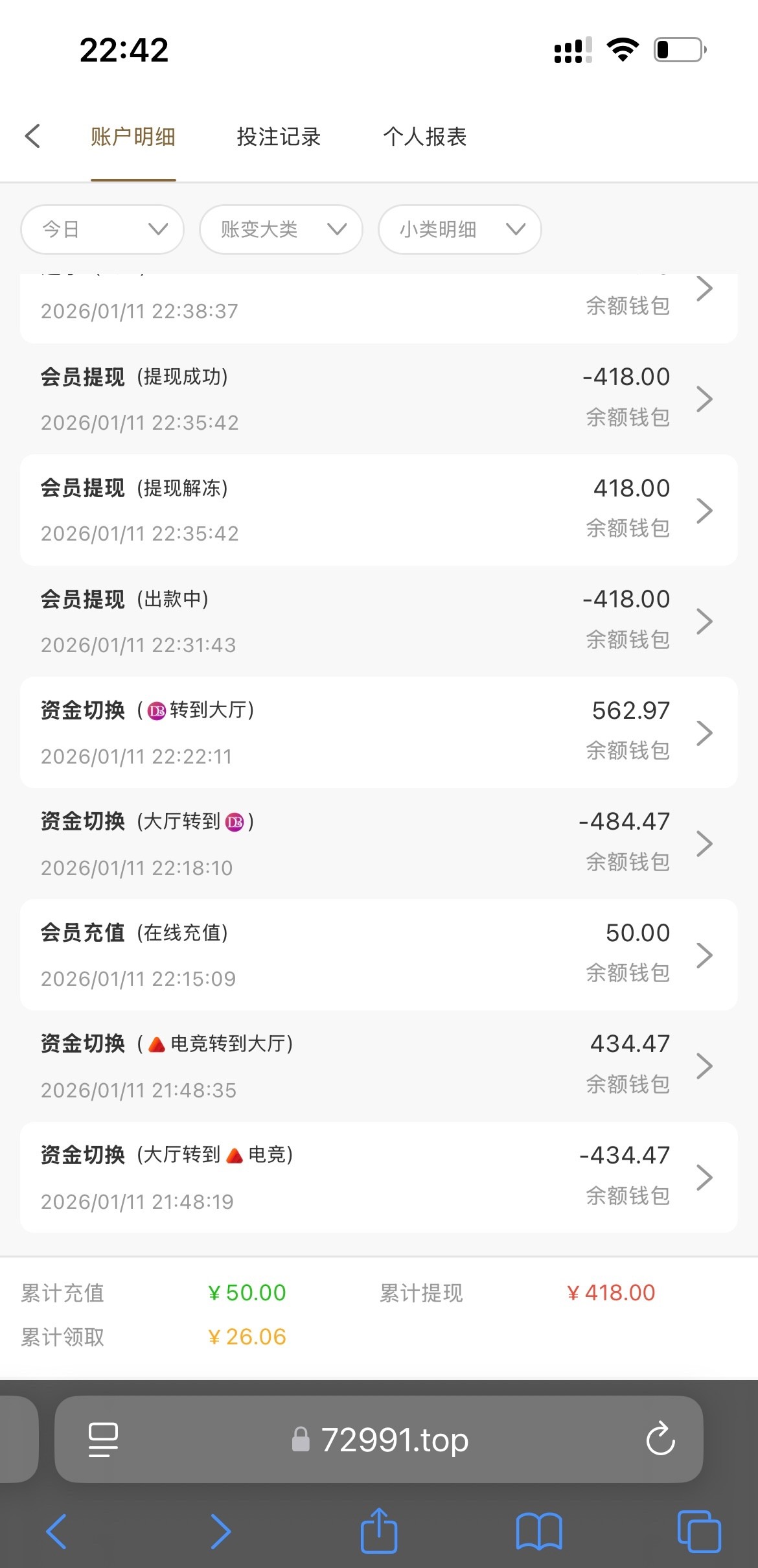 之前注册过特邀彩金,没充值过,今晚上来电话让登录领回归可以签到3天,领了7块,麻将拉了几下就给胡,磨了2个多小时打到450,提现说是新用户要充值50、就直接冲了50,百家乐又搞了100,提现3分钟左右到账 72991.com