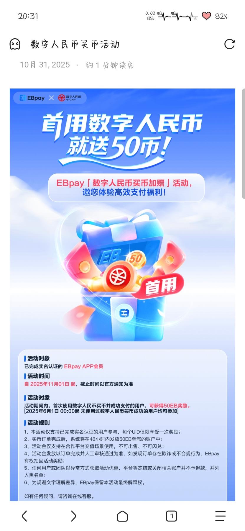 EB首次使用数字人民币买币送50